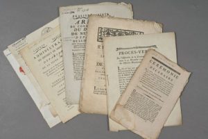 SEINE-MARITIME. Ensemble de 13 documents (10 imprimés et 3 lettres). Dossier concernant la commune de Neufchâtel-en-Bray durant la Révolution. « Cérémonie décadaire qui se célèbre, chaque jour de décade, à Neufchatel, dans le temple de l'Éternel, ainsi que celle de la fête de l'Être suprême, le 10 prairial ; celle du 14 juillet 1789, du 10 août 1792 […] » (imprimé à Neufchâtel, 22 pp. in-8). « Procès-verbal de l'Assemblée de la commune de Neufchâtel, tenue le 13 novembre 1791, pour l'élection des officiers municipaux » (16 pp. in-4, imprimé à Rouen). « Règlement pour la Garde nationale de la ville de Neufchâtel en Normandie fait en l'assemblée du Conseil général tenu à l'Hôtel commun de la ville, le 21 mai 1790 » (114 pp. in-4, imprimé à Rouen) ; « Arrêté du Conseil général de Neufchâtel, département de la Seine Inférieure, sur l'économie & la bonne administration qu'il faut apporter dans la distribution des subsistances & la surveillance qu'il faut mettre dans la conduite des meuniers » (2 germinal an 2, 4 pp. in-4, imprimé à Rouen). « Tarif pour faciliter dans toute l'étendue du district de Neufchâtel la recette ou paiement des fermages […] » ; « Procès-verbal de l'installation de MM. les juges du tribunal de district de Neufchâtel » (1790, 11 pp. in-4, imprimé à Rouen) ; certificat signé par les membres de la Société Populaire de Neufchâtel (19 brumaire an 2), etc.