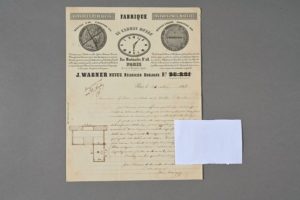 SEINE-ET-MARNE. Lettre de l'horloger J. Wagner à l'architecte Gilson à Melun. 1 p. in-4. Paris, 31 mai 1848. En-tête illustré (attributs royaux biffés) Lettre sur l'horloge de l'hôtel de ville de Melun, ornée d'un croquis. Il l'informe que l'horloge destinée à l'hôtel de ville de Melun sera prête vers le 10 juin. « Nous terminons les dernières pièces qui se rattachent à cette horloge ». Il espère que de son côté il se sera occupé du cabinet qui doit la renfermer. « Je vous rappelle que ce cabinet doit avoir au moins 2m20 de largeur sur un mètre de profondeur, et devra être établi à l'emplacement A indiqué ci-contre. Il est indispensable que la porte soit établie côté aa […]. Pour éclairer l'intérieur de ce cabinet, il convient de pratiquer une fenêtre en b ou en c, dans la toiture » (croquis). Seine-et-Marne : voir également n°567