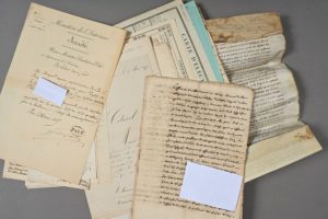 VAUCLUSE. 25 documents divers, XIVe-XIXe. - Parchemin de 1377 (46 x 37 cm), en latin, concernant Carpentras. - Arrêté signé par le comte de Gasparin pour le peintre Bézard le chargeant d'exécuter pour l'église de la ville d'Orange un tableau représentant St Eutrope (une somme de 2400 francs lui est allouée), 1837. - Lettres diverses : Pojadet (Carpentras, 1865), Larnage (Mondragon, 1750), Olivary (à l'abbé de Roubion, Avignon, 1756), abbé d'Oppède (2, Cavaillon, 1720, au sujet d'un paiement par billets de banque de Law) - Lettre autographe signée de M. de la Plane à M. de Caderousse-Cambis au sujet d'un prisonnier gardé au Pont de Sorgues (Carpentras, vers 1580, 1 p. in-folio, adresse au dos). - Lettre signée par Claire de Maynier d'Oppède (Cavaillon, 1579), au sujet de la succession de son père, le magistrat Jean de Maynier baron d'Oppède (1495-1558), 1 p. in-folio, adresse au dos. - Procuration pour une religieuse du monastère de la Visitation Ste Marie de Carpentras, - Cartes d'électeur, - Pièce manuscrite XVIIIe : « Épitaphe de messire Dominique abbé de Guillem supérieur et directeur du séminaire de St Charles d'Avignon […] ». Comte de Seytres-Caumont et duc de Caumont-Seytres (2 P.A.S. Avignon 1788-1789). Brun de La Martinière (P.A.S. Avignon 1770). Lettre du chanoine Doulhon (Bollène 1759 à M. de La Brouchetière à Sérignan) + une autre lettre de 1697. - Pierre Celse GAUTIER, docteur en médecine à Avignon (il reçut le titre le 2 juin 1729) : manuscrit A.S. : ordonnance médicale (Avignon 1749, 2 pp. in-4). - Manuscrit de la fin du XVIe ou du début du XVIIe, 12 pp. in-4. Transcription en français d'un acte du 24 mars 1441 : nouveau bail fait par Bertrand Esclaudolain, prieur claustral de l'Eglise Notre-Dame Ste Marie de Doms d'Avignon, à noble homme Jehan Taillefer, d'Arles, des dépendances du Prieuré Ste Marie de l'Isle soubz Bargan d'Arles. - Manuscrit du XVIIe de 21 pp. petit in-4 : vente d'une pension durant le pontificat d'Urbain VIII, par deux consuls de Villeneuve Saint-André les Avignon à un notaire d'Avignon. Vaucluse : voir également n°125, 162 et 823