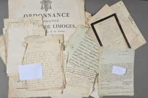 HAUTE-VIENNE. Plus d'une centaine de documents divers, XVIIe-XIXe. - Affiche : « Ordonnance de Monseigneur l'évêque de Limoges pour l'anniversaire du 21 janvier » (Limoges, 15 janvier 1816) - François-Xavier Genty de La Borderie, lieutenant général au siège de Bellac. 2 lettres autographes signées, au sujet de sa charge de trésorier de France (Bellac, 1782-1783, déchirure à une lettre) - Émile de Montégut (Limoges 1825-1895), écrivain limougeaud. 2 manuscrits autographes signés (« Collabos » et « La Pivoine »), 4 pp. grand in-folio, accompagnés de 2 L.A.S. - Certificat de bonne conduite pour un instituteur (Limoges, an 2, cachet de cire) - 8 lettres adressées à Maillard de la Coutuse, conseiller du roi, président trésorier général de France au bureau des finances à Limoges (1684-1716). - Paul Mailhard, bourgeois et marchand de Limoges : 40 reçus et documents divers. - Ensemble de 40 documents (XVIIIe-début XIXe) concernant la famille Benoist du Buis (conseiller du Roi en la cour présidiale de Limoges, au XVIIIe) : comptes, mémoires, reçus du chanoine de Saint-Martial, ensemble de reçus de l'hôpital général de Limoges, lettres, conventions, travaux pour sa propriété de Couzeix, etc. - Une vingtaine de documents divers sur Limoges : ordre de faire « ouvrir les étangs à l'effet de laisser couler l'eau pour le nettoyement des latrines dudit hôpital » (1788), reçu de la Taille (1687), exemplaire du Journal de Limoges du 3 mars 1790, lettre écrite de Mantera à un marchand de Limoges (1763), etc.