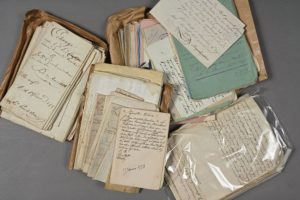 VOSGES. Un petit carton contenant plus d'une centaine de documents, XVIIIe-XIXe. Quelques-uns en allemand (certains concernent l'Alsace). Archive familiale (famille Chevalier, à Provenchères, près de Saint-Dié) et par alliance famille Humbert (également à Provenchères), en particulier concernant «Jean-Baptiste Chevalier, greffier des terres et seigneurie de Provenchères et receveur des fermes du Roy audit lieu»: lettres, partages, acquisitions, lettre de remise en liberté du comité de surveillance de Strasbourg pour le citoyen chevalier détenu au séminaire, certificat de religion catholique (1772), baptêmes, traités de mariage, «constitution pour la fabrique de l'église paroissiale de Provenchères» (1752), lettres familiales, lettres de la famille de Bulach (Alsace, certaines en allemand), «inventaire de la succession du sieur Louis Jean Baptiste Chevalier vivant propriétaire à Provenchères» (1820, 31 pp. in-folio), plan manuscrit, papiers militaires, «mémoire de Mr Humbert marchand de vins en gros à Provenchères», etc.