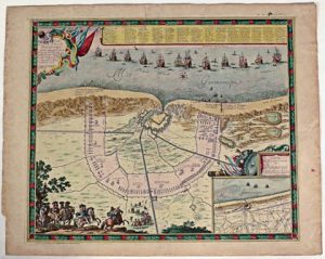 DOVÉ, Martinus.- Galloflandria, in qua castellaniae Lilana, Duacena, & Orchiesia, cum dependentibus, necnon Tornacum & Tornacesium. [Amsterdam], G. Blaeu, [milieu du 17e siècle], sous cadre.— Plan de la ville et du Port de Dunquerque assiégé par les armées du roy très chrétien Louys XIIII commandées par Mons. le marq. de Turenne, le 24 de May, rendue à l'obéissance de sa Majesté, le 25 de Juin en suivant 1658. Paris, de Beaulieu, s.d., feuillet volant. Grand plan avec importante légende des dispositifs militaires, bien décoré.