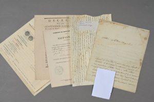 VOSGES. 10 documents divers, XVIIe-XXe. - [Mirecourt]. Lettre d'Elisabeth de Bertrand, veuve de Léopold, adressée à « Son Altesse Royale » (Mirecourt, 1788) + 2 lettres de son fils adressées à elle. Au sujet de la mort de son mari, Léopold et de la pension dont il jouissait comme « gentilhomme et filleul de son Altesse Royale le duc Léopold de glorieuse mémoire […] ». - Parchemin de 1691. Contrat d'acquêt à Mirecourt. - Laissez-passer (Saint-Dié-des-Vosges, mars 1871) - [Bourreaux]. Décret de la Convention nationale du 3 frimaire an 2, lu au directoire du département des Vosges […] qui accorde un supplément de traitement aux exécuteurs des jugements criminels ». Imprimé à Épinal, « de l'imprimerie nationale d'Haener ». - 2 lettres des papeteries de Laval-Bruyères (Vosges), 1912, détaillant leurs conditions d'approvisionnement en bois. - Jean-François ANDRÉ (Lignéville, Vosges 1744-ap. 1825), littérateur. L.A.S. (3 pp. in-4, 1822, au sujet de la publication de son Examen impartial de la vie privée et publique de Louis XVI) + note autographe (4 pp. in-4, « Liste des ouvrages ou traduction ou journaux de Jn Fr André âgé de 81 ans et 3 mois le 26 Xbre 1825 » + note biographique ancienne. Vosges : voir également n°868