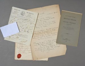 TERRITOIRE-DE-BELFORT. 4 documents, XVIIe-XIXe. - Certificat du gouverneur des ville et château de Belfort, Camus de Morton (Belfort, 1693, cachet de cire armorié) - Petite brochure publiée à Melle en 1884 : « Ce qu'il convient de penser des prétendus services du colonel Denfert à Belfort » (8 pp. in-8). - Edouard OGIER D'IRVY (1843-1902). Poème autographe signé, 2 pp. in-folio, daté de Belfort. - Laissez-passer pour Colmar (Belfort, 1821).