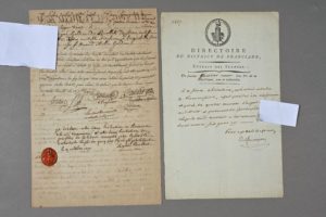 SEINE-SAINT-DENIS. Pièce signée le président et les membres du comité des Récollets section de Bondy, également signée par le frère récollet Philibert Langlois. 2 pp. in-folio. Cachet de cire rouge du district des Récollets. Paris, 28 septembre - 4 octobre 1790. Renoncement d'un frère Récollet de Saint-Denis, le frère Philibert Langlois. « Extrait du registre des professions faites par les révérends pères Recollets de la province de Saint-Denis en France » contenant la copie de la profession de foi du frère Philibert Langlois, certifié par le frère Armand Mirlin et par les autorités de la section de Bondi. Avec, en dessous, 4 lignes de renonciations, signées. « Je déclare etre dans l'intention de renoncer à la vie commune et estre dans l'intention de profiter de la liberté accordée par l'assemblée nationale, en foi de quoi j'ay signé ». On joint une pièce signée par DEFAUCONPRET, 1 p. in-folio à en-tête et vignette du district de Franciade [Saint-Denis], 15 fructidor an 3. Extrait des séances du directoire contenant le procès-verbal de pesée de couverts d'argent déposés au district provenant d'un prêtre déporté.