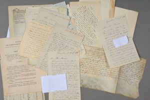 VAL-DE-MARNE. Une trentaine de documents divers, XVIIe-XXe. - 4 lettres de la Société des Amis de Vincennes, accompagnées de notes manuscrites, au sujet du testament du comte d'Hérouville rédigé au château de Vincennes en 1787. - Parchemin de 1646. Arrêt rendu à l'encontre d'un militaire emprisonné à Gentilly, pour lui faire son procès. - Gouache signée Louise-Marie PEYRE (1897-1975) : vue de Bry-sur-Marne (1960, 22,5 x 15,5 cm). - Nicolas de Frémont d'Auneuil, seigneur de Bry-sur-Marne (il fit construire le château de Bry à partir de 1690). Pièce signée sur parchemin (1704). - 19 lettres et 1 manuscrit de personnalités natives du Val de Marne : Louis Massignon. Gustave Boissonade (10 intéressantes lettres à Ferdinand Denis conservateur de la Bibliothèque Sainte-Geneviève). Pierre Mille (4 lettres et 1 manuscrit en hommage à René Ghil). Pierre Imbart de La Tour. Numa (comédien, 3 lettres). - 2 programmes imprimés du concours de l'École impériale vétérinaire d'Alfort (1864-1869), certificat de services (Vincennes 1818), procès-verbal de nomination d'expert (Vincennes, an 6), passeport révolutionnaire (Vitry-sur-Seine 1793, cachet avec arbre de la Liberté de Vitry).