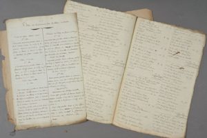 VAL DE MARNE. 2 manuscrits, 7 et 7 pp. in-folio, l'un signé et daté de Germinal an 2. « Terre de la ci-devant cure de Thiais à vendre » (détail des différents lots mis à la vente) et « Fabrique & cure de Thiais » (détail et comptes des terres de la fabrique). Val de Marne : voir également n°699