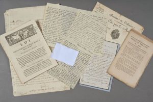 GUADELOUPE. Une quinzaine de documents divers, XVIIIe-XXe. - Eugène Bouchet, propriétaire à Gosier (8 lettres à sa cousine, 29 pp. in-8, Pointe-à-Pitre, avril-décembre 1858). Joint : deux autres lettres écrites de Pointe-à-Pitre en 1910. - 3 imprimés : Sénatus-consulte concernant l'Île française de la Guadeloupe du 14 oct. 1813 (8 pp. in-8, non coupé). Bulletin des lois de la République française concernant la division du territoire des colonies occidentales (4 brumaire an 6, 16 pp. in-8). Loi relative à l'organisation des troupes coloniales en régimens de ligne, du 27 août 1792. - Certificat de services en Guadeloupe en 1788 ; lettre annonçant le décès d'un officier à Basse-Terre (1825) ; carte postale expédiée en 1902 : vue de Guadeloupe (Saint-Barthélemy, savane de St-Jean). - Mémoire manuscrit du XVIIIe (5 pp. in-folio), de dépenses faites en Guadeloupe de 1763 à 1765, signé Desobeaux.