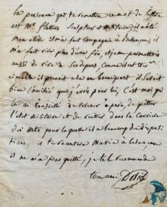 Jacques-Louis DAVID (1748-1825). Lettre autographe signée, 1 p. in-4. [Après 1810, probablement juillet-août 1815]. Restes d'onglet. Recommandation de son élève, le sculpteur Jean-Jacques Flatters (1786-1845), qui fut également élève de Houdon et membre de l'Institut (il sera second prix de Rome en 1813) ; elle est écrite de Besançon, ville où David trouva refuge après Waterloo. « La personne qui te remettra ce mot de lettre est Mr Flatters, sculpteur et militaire, il a été mon élève, il m'a fait compagnie à Besançon, il m'a fait rire plus d'une fois, et je me permettois aussi de rire à ses dépens ; comme il est très aimable, il prenoit cela de bonne part, il savoit bien l'amitié que j'avois pour lui ; c'est moi qui lui ai conseillé de revenir à Paris, de quitter l'état militaire et de rentrer dans la carrière des arts pour laquelle il a beaucoup de dispositions. Il te racontera ma vie à Besançon, il ne m'a pas quitté, je te le recommande. Ton ami David ». La lettre est écrite sur le feuillet vierge d'une lettre de Radet qui lui est adressée (« monsieur le baron David, premier peintre de S.M. l'Empereur, rue d'Enfer n°13 »), en date du 11 mai [1810].