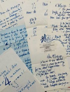 Maurice ESTÈVE (Culan 1904-2001), peintre. 5 lettres autographes signées au peintre Philippe Taillardat. 2 pp. in-4 et 14 pp. in-8. Culan et Paris, 1969-1971. Enveloppes. Belle correspondance amicale illustrée d'un petit dessin de Tour Eiffel. Amusante lettre après l'envoi d'un catalogue qui n'est jamais arrivé. « Je n'oserai plus confier au service postal - en direction de votre adresse - les témoignages de mes immortels chef d'œuvres, fruits murs et savoureux d'un génie singulier bien que Berrichon et portant sous la calotte de l'Odéon la Bonne-Parole-Bidon ainsi que vous me l'avez révélé […]. Philippe, j'ai beaucoup aimé vos toiles. Ça bouge, ça prend de l'ampleur, ça s'approfondit ; Bravo, courage et joie ! […] On travaille toujours avec difficulté et nous restons toujours en deçà de nos espoirs… à moins d'être né sous le signe de la grâce, du génie, de la Royauté, et de porter le nom glorieux de … MATHIEU, ornement et figure de proue de la cinquième République […]. Je suis en cure par ce temps résolument figuratif, il neige et il gèle […]. « Merci pour les « Hâmours d'Estève, jeune plumitif ! ». Je savoure l'écriture très « villa Médicis » d'André Theuriet, académicien, les illustrations du grand Fernand Fau ajoutent au plaisir… délicat de la lecture (c'est l'antidote de Léautaud) […]. Je ne suis pas un « Maître » non plus, en mon art bien-aimé, moins encore un Maître-à-penser, n'étant qu'un petit tout petit mal-pensant… Ce qui est bien quenu… dirait Queneau ! […]. Hélas, je ne pourrai. Pris tous les jours par la litho et le soir par les mondanités. De plus, je vais recevoir encore un prix cette semaine ! (je ne sais plus où les mettre !) […] ».