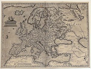 (Europe) - ORTELIUS, Abraham.- Europae. Gravure sur cuivre, 34 x 46,2 cm + grandes marges, en noir (pli central, toute faible tache au milieu en haut).