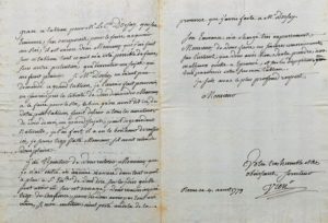 Joseph-Marie VIEN (1716-1809), peintre, inhumé au Panthéon. Lettre autographe signée, 3 pp. in-4. Rome, 4 août 1779. Rare et superbe lettre de Rome, au sujet d'un tableau commandé par le comte d'Orsay [très probablement Hector déterminant Pâris à prendre les armes pour la défense de la patrie, commandé par le comte d'Orsay lors de son séjour à Rome, en 1776, et terminé en 1779 ; saisi sous la Révolution et aujourd'hui au Musée national du château de Fontainebleau]. « J'ai veu par la lettre que vous avés écrit en réponse à M. le Cal de Bernis, qui a eu la bonté de me communiquer, que la plaisanterie qu'il m'avoit fait un jour en dinant chez lui, en me disant qu'il m'avoit joué un tour, et qu'il vous avoit écrit sur mon tableau n'est que trop vrai. Je n'avois aucun doute sur le plaisir qu'il avoit fait à Son Éminence, par les éloges les plus flatteurs qu'elle avoit bien voulu me prodiguer, elle m'a procuré l'honneur de recevoir tous les ambassadeurs, et autres personnes de distinction à qui elle avoit inspiré les mêmes sentiments pour cet ouvrage, comme les bontés de M. le Cal lui ont fait voir ce tableau digne d'appartenir au Roi, toutes les personnes qui l'ont veu, en ont dit autant. Je puis vous assurer, Monsieur, qu'il ne m'est jamais venu en tête, lorsque j'ai fait de bonne grace ce tableau pour M. le Cte d'Orsay, que Son Éminence s'en occuperoit pour le faire acquérir au Roi ; il est encore vrai, monsieur, que j'ai fait sur ce tableau tout ce qu'il m'a été possible de faire, sans autre prétention que d'exécuter un sujet qui me fesoit plaisir. Si M. d'Orsay ne m'eut pas demandé ce grand tableau, je l'aurois fait pour moi, ou j'aurois pris la liberté de vous demander, monsieur, à le faire pour le Roi, le bien qu'on avoit dit ici, de votre petit tableau, fesoit désirer à tous les amateurs, de voir de moi, un grand sujet peint de grandeur naturelle, je l'ai fait, il a eu le bonheur de réussir ici, je serois trop flatté, monsieur, s'il avoit celui de vous plaire. J'ai l'honneur de vous réitérer, Monsieur, que je n'ai entré en aucune manière dans tout ce qu'il a pleu à S. Excellence de vous dire sur les idées qu'elle peut avoir eu sur cet ouvrage, vous m'avés inspiré trop de confiance pour ne vous avoir pas écrit moi même, si mon ambition m'eut porté au delà de la promesse que j'avois faite à M. d'Orsay […] ».