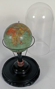 (Globe) - THOMAS, G.- Globe terrestre Paris, G. Thomas, [c. 1910]. Globe composé de 12 fuseaux et de 2 calottes polaires en chromolithographie, monté sur un pied central de bois noir, diamètre 10 cm, hauteur totale 21 cm. Sous globe de verre avec...