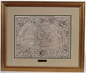 (Monde) - MUNSTER, Sébastien.- Ptolemaisch General Tafel begreiffend die halbe Kügel der Welt. Gravure sur bois, TC 25 x 34 cm + marges. Sous passe-partout, vitre et cadre de bois doré (non désencadrée).