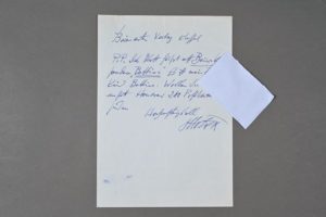 Otto DIX (1891-1961), peintre expressionniste allemand. Lettre autographe signée à la maison d'édition allemande Bärenreiter, à Cassel. ½ p. in-4. Otto Dix indique à son éditeur que le titre du dessin n'est pas le bon : « Barenreiter Verlag Kassel P.P. das Blatt heisst nicht Bauernking sondern « Bettina ». Es ist mein Enkelkind Bettina [...] ». [La planche ne s'intitule pas La Fille de la campagne, mais Bettina. Bettina est ma petite fille]. Il demande à ce qu'on lui fasse parvenir 200 exemplaires sur cartes. A la mort de sa fille Nelly, en 1955, Otto Dix adopta Bettina.