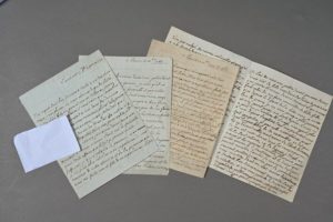 Anne-Marie Le Page DU BOCCAGE (1710-1802), femme de lettres. 2 L.A.S. et 2 L.A. à son neveu et à ses nièces. 9 pp. in-4. 1785-1797. Charmante correspondance familiale écrite à la fin de sa vie, dévoilant également ses difficultés. « Le tems où nous sommes est stérile en nouvelles, tout se passe à Fontainebleau ; (ici (où reste peu de monde) on s'amuse à faire des contes de sorciers, on dit par exemple, que Cagliostro toujours à La Bastille a pourtant été à Lyon commander un souper de 20 personnes […]. Je ne vois presque plus personne et n'ai point passé ma porte depuis 13 mois, ni à pied ni en voiture de louage, n'en ayant plus à moi depuis longtemps, tous mes parents et amis sont éparpillez […] ».