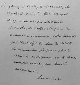Annie ERNAUX (1940), prix Nobel de littérature (2022). Manuscrit autographe et pièce autographe signée, 2 pp. in-8, sur bristol surmontés d'un portrait de l'auteur tiré d'un magazine. 2000 et 2015. Extrait de son roman Les Années, paru en 2008, roman autobiographique, nostalgique, sur l'urgence de fixer par écrit le temps qui passe, qui obtint de nombreux prix. « Plus que tout, maintenant, elle voudrait saisir la lumière qui baigne les visages désormais invisibles, des nappes chargées de nourritures évanouies, cette lumière qui était déjà là dans les récits des dimanches d'enfance et n'a cessé de se déposer sur les choses aussitôt vécues, une lumière antérieure ».