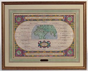 (Monde) - ORTELIUS, Abraham.- Aevi Veterus, Typus Geographicus. Gravure sur cuivre, TC 31,5 x 44,4 cm + marges, rehaussée à l'aquarelle. Sous passe-partout, vitre et cadre de bois doré (non désencadrée).