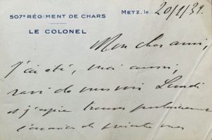 Charles de GAULLE (1890-1970). Carte autographe signée [à Jean Auburtin (1904-1981)]. 2 pp. in-12 oblong, sur une carte à l'entête « 507e régiment de chars - le colonel ». Metz, 20 janvier 1939. Pliures marquées, légèrement empoussiérée. Lettre de De Gaulle à son grand ami Jean Auburtin, qui a puissamment contribué à propager ses idées développées dans Vers l'armée de métier. De Gaulle était alors colonel au sein du 507e régiment de chars, à Metz. « Mon cher ami, J'ai été, moi aussi, ravi de vous voir lundi et j'espère trouver prochainement l'occasion de présenter mes hommages à Madame Auburtin. Ci-joint la carte de cet excellent et trop aimable Sénac. Il veut bien ne plus dire de [mes, biffé] nos idées "qu'elles sont impossibles, pas souhaitables, contraires à la logique et à l'Histoire... Affectueusement à vous. C. de Gaulle ».