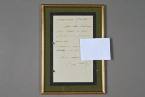 Charles de GAULLE (1890-1970). Lettre autographe signée à Louis-Philippe Orttner (1908-1985), secrétaire général du Comité de libération du Bas-Rhin. 1 p. in-8, sur papier de deuil à en-tête « Le Général de Gaulle ». 5 juillet 1948. Enveloppe autographe (deuil). Petit trou de classeur en marge. Encadrée. Lettre écrite sur papier de deuil (après la mort de sa fille Anne). « Mon cher Orttner, votre lettre d'hier ma touché. Je vous en remercie. Comme vous le dites, octobre sera très important. Bien amicalement. C. de Gaulle ».