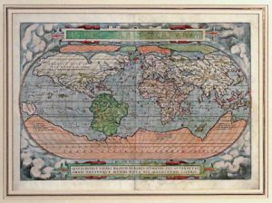 Première version (sur 3) de la mappemonde par Ortelius telle que parue dès 1570 dans son célèbre "Theatrum Orbis Terrarum", le premier atlas dans le sens moderne du mot. Il s'agit d'une réduction de la mappemonde donnée par Mercator en 1569. Notre exemplaire présente les caractéristiques du 3e tirage (1575) : trace d'une cassure de la plaque au coin infér. gauche et hachures croisées en dessous des bouts du cartouche du bas. # Shirley, 122; # van den Broecke (2011) Ort1; # van der Krogt [0001:31A]; # Karrow 1/6. ^ First version (3th state : 1575) of the famous world map by Ortelius. Copper-engraving, highlighted, framed.