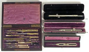 (Instruments) - Ens. 4 étuis - Compas (dont 3 de proportion) et instruments de dessin en métal blanc, laiton et ivoire. Sous 3 étuis en chagrin (un avec mention "C. Riefler-Nesselwang & Munchen") et 1 en bois (avec mention "Louis Verhaeght à...