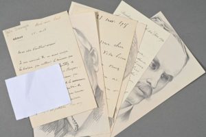 [POLITIQUE]. Ensemble de 3 lettres de Présidents français : - Paul DESCHANEL (1855-1922), président de la République de février à septembre 1920. Lettre autographe signée. 2 pp. in-12. 21 novembre 1915. Belle lettre de soutien à un soldat de la Première guerre mondiale. « Merci, mon cher ami, de votre bonne lettre. Mes vœux fervents vous accompagnent, vous et vos vaillants compagnons d'armes. Je vous fais mettre en congé. A vous de tout cœur ». On joint un dessin original au crayon représentant Deschanel en buste (trace d'onglet au dos). - Gaston DOUMERGUE (1863-1937), président de la République de 1924 à 1931. Lettre autographe signée à Denys Cochin de l'Académie française. 2 pp. in-8° sur papier à en-tête du Sénat. [Paris], 25 décembre 1913. Belle lettre relative à Lamartine et à son rôle politique. « […] Je vous remercie de m'avoir envoyé la brochure qui contient le discours que vous avez prononcé à l'inauguration du monument de Lamartine à Bergues. Je l'avais lu dans les journaux qui l'ont publié au lendemain de la cérémonie et de loin, je vous avais applaudi de grand cœur. Vous venez de me donner l'occasion de le relire. Ma première impression s'est fortifiée. Vous avez fait de l'homme politique et du diplomate un admirable portrait et résumé en un raccourci puissant et vivant une période des plus intéressantes et plus riches en enseignements de notre histoire presque contemporaine ». On joint un dessin original au crayon représentant Doumergue en buste (trace d'onglet au dos). - Jean Casimir PERIER (1847-1907), président de la République de juin 1894 à janvier 1895. Lettre autographe signée. 3 pp. in-12 sur papier à en-tête de la Présidence du Conseil. Paris. 20 janvier 1894. « […] Je lis votre correspondance avec intérêt et j'y trouve la confirmation es bons souvenirs que j'ai gardés de vous. Je pense qu'on est maintenant un peu moins nerveux au sujet des bruits relatifs à l'Italie. Votre patriotisme s'était un peu trop alarmé et avait un peu grossi les proportions. Nous devons regarder de ce côté mais il n'y a pas - pour le moment - d'inquiétudes à avoir. Je vous envoie sur une affaire que vous devez bien connaître, une note vous indiquant où nous en sommes et le secours que peuvent nous donner vos conversations dirigées dans un certain sens ». On joint un dessin original au crayon représentant Casimir Perier en buste.