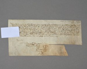 RENÉ DE VALOIS DUC D'ALENÇON (1454-1492), comte du Perche, emprisonné par Louis XI à cause du désordre de ses affaires et de sa débauche, il participa ensuite à la Guerre folle mais fut pardonné par Charles VIII. Pièce signée sur parchemin. 27 décembre 1489. 12,5 x 25 cm. Sans le sceau. « Nous René duc dalencon filz de France comte duperche et vicomte de beaumont confessons avoir receu » avoir reçu du grenetier du grenier à sel de Verneuil, la somme de 88 livres tournois. Rare.