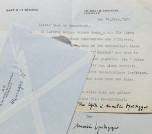 Martin HEIDEGGER (1889-1976), philosophe allemand. 2 lettres dactylographiées signées à Frédéric de Towarnicki. 2 pp. in-8 oblong à son en-tête. Déc. 1968 - fév. 1971. Une enveloppe. Remerciements chaleureux après son article : « Meine Einstellung zu den feuilletonistischen Berichten kennen Sie ja; aber ich möchte Ihnen doch sagen, dass Sie hier mit Ihrer lieben Frau jederzeit bei einem Besuch freundlich aufgenommen werden. Vielen Dank für die gutgelungenen Bilder. Mit den besten Wünschen für Arbeit und Wohlergehen grüssen wir beide Sie und Ihre Frau." La seconde lettre, est écrite en son nom par son épouse, mais est signée par lui. Elle lui demande de comprendre les raisons du refus d'Heidegger de réimprimer l'interview et lui rappelle les différends qu'il a eu par le passé avec l'Express et le Spiegel. « Im Auftrag meines Mannes danken wir für Ihren Brief und die Übersendung der beiden Ausschnitte aus L'Express. Mein Mann bittet es zu verstehen, wenn er den nochmaligen Nachdruck des 'Interview' nicht gestattet. Der « L'Express » hat sich indieser Angelegenheit gegenüber meinem Mann und gegenüber dem "Spiegel" so korrekt erzeigt, dass von Ihrer Seite nun nicht nochmals die Angelegenheit aufgerührt werden darf. Ihre beabsichtigte Veröffentlichung der verschiedenen "Interviews" kann auch ohne den Namen Heidegger erfolgreich sein. Wir wünschen Ihnen und Ihrer Familie alles Gute und grüssen […] ».
