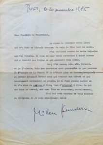 Milan KUNDERA (1929-2023), romancier et essayiste. Lettre dactylographiée signée à Frédéric …