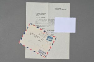 Herbert MARCUSE (1898-1979), philosophe et sociologue marxiste, américain d'origine allemande, membre de l'École de Francfort. Lettre dactylographiée signée à Frédéric de Towarnicki. Pontresina (Suisse), 1 p. in-4. En allemand. Enveloppe. Il doit se rendre directement aux Etats-Unis et ne pourra passer par Paris, ce qui le désole car il aurait beaucoup aimé parler à Schöffer et visiter son atelier… [Nicolas [Miklos] Schöffer (1912-1992), sculpteur et plasticien d'origine hongroise]. « Was ich gefürchtet habe, ist leider eingetreten : ich muss direct nach den Vereinigten Staaten zurückfliegen, ohne mich noch, wie geplant, in Paris auch nur einem Tag aufhalten zu können. Dies tut mir umsomehr leid, als ich sehr gerne mit Herrn Schöffer gessprochen und sein Atelier aufgesucht hätte. Ich wäre Ihnen dankbar, wenn Sie ihm mein Bedauern und meine Entschuldigung übermitteln würden […]".