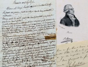 Bertrand BARÈRE (Tarbes 1755-1841), conventionnel montagnard, membre du Comité de Salut public. Lettre autographe signée au conventionnel montagnard et président du Directoire exécutif Jean-François Reubell. 2 pp. ½ in-4. Brumaire an 4 [oct.-nov. 1795]. Déchirures aux plis avec consolidations au ruban adhésif ayant laissé des marques. Accompagné d'un Billet autographe signé de Félix Lepeletier (1767-1837) : « J'ai trouvé hier en fouillant dans un tas de papiers, cette lettre de B. à laquelle vous teniez tant. Je m'empresse de vous la restituer, en vous faisant de plus mille compliments ». Avec un portrait gravé. Magnifique lettre écrite au moment où, condamné à la déportation en Guyane, il réussit à s'évader de la prison de Saintes et se cacher à Bordeaux, et il se trouve exclu de la loi d'amnistie votée le 4 brumaire an 4 [26 octobre 1795]. Il expose sa défense, rappelle tout ce qu'il a fait pour la République, et demande à être compris dans la loi d'amnistie. « Tu m'as accordé ton amitié quand j'étais dans la prospérité : que feras-tu quand je suis dans l'infortune ? Je garde précieusement une lettre républicaine et amicale que tu m'écrivis le 15 janvier 1793 de Mayence, relativement aux discours sur le jugement du tyran Capet. Tu me félicitais de mon courage contre l'opinion contraire dominante alors en faveur de l'appel au peuple ; et cependant aujourd'hui les royalistes sont libres, et moi républicain, je suis fugitif de caverne en caverne. J'ai fait punir le tyran Capet, époque qui a fondé la République…J'ai seul opéré une vigoureuse résistance aux attentats du 31 mai et 2 juin, époque qui a fondé la tyrannie des triumvirs… J'ai fait mettre hors la loi le tyran Robespierre et la commune conspiratrice, le 9 thermidor au soir, époque qui a renversé la tyrannie… Et cependant, quand la République triomphe de ses ennemis, je suis proscrit. J'ai fait trois cents rapports, j'ai électrisé les armées et propagé la victoire en célébrant leurs exploits. J'ai dénoncé les crimes du gouvernement anglais qui me poursuit ouvertement et qui m'opprime impunément en France ; et cependant nul Républicain ne vient à mon secours ». Il donne les exemples de Vadier et Peyssard, conventionnels aujourd'hui libres. « Comment donc, serais-je le seul Républicain respirant sur le sol de la France et à l'ombre de notre sage constitution, pour qui cette constitution serait stérile, et la loi du 4 brumaire inutile ou violée ? […] J'ai applaudi comme tout bon citoyen au choix que le Corps législatif a fait de toi pour le Directoire exécutif […] ». Il lui rappelle la manière dont il l'a défendu devant la Convention après la reddition de Mayence. « Ce fut moi qui me présentai à la tribune pour te déffendre contre les ennemis. Fort de l'opinion que j'ai toujours eue de ton patriotisme, je fis alors ce que je ferai toujours, je te fis rendre justice en forçant les ennemis au silence, et en te faisant donner un nouveau moyen de la confiance de la Convention nationale. Tu partis pour la Vendée et c'est à moi qu'au milieu des défiances de cette terrible époque, tu m'écrivis confidentiellement sur cette plaie de la patrie […]. Je te crois fortement animé du désir de faire cesser les vengeances […]. J'ai pour moi ma conscience & la constitution huit mois de prison et la loi du 4 brumaire. Je te demande de maintenir ma liberté d'après cette loi […] ».