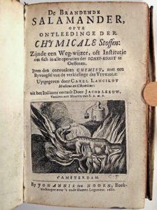 (Chimie & Alchimie) - LANCILOTTI, Carlo.- De brandende Salamander, ofte ontleedinge der chymicale stoffen [...]. Amsterdam, Johannis ten Hoorn, 1680. In-8° : [24]-286 [i.e. 290]-[4]-38-[12] pp.; 4 platen (sporadische vlekjes, mispaginering voorwerk...