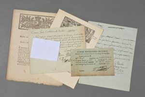 GARDE BOURGEOISE DE PARIS ET GARDE CONSTITUTIONNELLE DU ROI. - Garde bourgeoise de Paris [instituée le 13 juillet 1789, en vue de maintenir l'ordre]. Pièce pré-imprimée, signée. Ordre à Mme Turgot de monter sa garde le 9 août [1789] au corps-de-Garde du Val-de-Grâce. Rare document. - Certificat signé par des officiers de la garde bourgeoise. « Je certifie que monsieur Etienne a pris les armes avec nous au poste de la rue Fromenteau à commencer du treize juillet 1789 et qu'il nous a été d'un grand secours […] ». Beau cachet de cire. - Certificat de la Garde Constitutionnelle du Roi. - 2 imprimés : Loi relative au licenciement de la Garde du Roi et Loi relative aux citoyens composant la ci-devant Garde du Roi.
