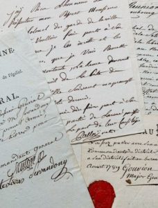 GARDE NATIONALE PARISIENNE. 8 documents. - Pièce signée SANTERRE, commandant général, 8 sept. 1792. Laissez-passer pour M. Servandoni. - lettre autographe signée de PALLOY (copie autographe) annonçant au colonel Haÿ, colonel de la Garde nationale, qu'il va remettre à ladite garde une lame provenant des verrous de la porte de la Bastille (vraisemblablement destinée à Lafayette), 1er mars 1792. - Laissez-passer du 23 août 1789, signé Gouvion, major-général [compagnon de Lafayette, tué en 1792 à Maubeuge] - Témoignage de satisfaction donné par la municipalité de Paris à la Garde nationale pour le zèle et le courage avec lesquels elle a veillé à la défense de la maison commune (24 juillet 1792, beau cachet de cire) - Procès-verbal d'élection d'officiers (section de la Réunion, 6 décembre 1792). Certificat de services (nombreuses signatures, 1791). Certificat du district des Théatins (oct. 1789). Certificat de services au sein de la Garde nationale parisienne (signé par Coulombeau).