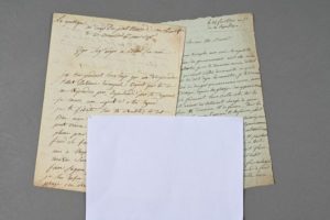 GUERRES DE L'OUEST. 2 lettres de soldats adressées à Élie Brunet à Saintes. - Viger, sergent major au 7e bataillon de la Charente-Inférieure. 3 pp. in-4. « Au camp du Pont Barré par Angers, 20 brumaire an 4 » [11 novembre 1795]. Adresse au dos avec marque postale d'Angers. « Tu es bien mieux auprès d'un bon feu qu'au Pont Barré où à peine je peux tenir ma plume pour t'écrire tant la rigueur du froid se fait sentir ; j'ai resté un mois à l'hôpital […]. Il y a dans les pays qui nous environnent une misère générale, vous ne pouvez rien vous procurer pour des monceaux d'assignats, il faut de l'argent royaliste, aussi je les (?) pour leur argent royaliste en leur donnant des sols républicains […] ». - X. Guillot. 2 pp. in-4. [Belle-Isle-en-Mer], 24 fructidor an 5 [10 septembre 1797]. Adresse au dos avec marque postale « Belle-Isle-en-Mer ». « Le parti républicain triomphe mon ami, les royalistes sont abatus et les rênes du gouvernement vont être mises entre les mains des patriotes, je ne te donnerai aucun détail sur la conspiration qui vient d'être découverte […] je te donnerai seulement une idée du danger que nous avons couru, mais qui à présent est dissipé. Depuis longtemps des approvisionnements extraordinaires se faisaient pour Belle-Isle, tous les jours ont voioit arriver des batiments chargés de grain, de bœuf, de foin, d'avoine et de farine, tous les sacs qui contenoient le grain l'avoine et la farine sont marqués de grande fleur de lys […]. Et pourtant malgré toutes ces provisions nous manquins de tout et on les gardoit pour les émigrés qui devoient faire comme ils ont fait à Mézières venir sous l'habit républicain changer la garnison, nous une fois embarqués pour le continent nous devions être coulés à fond par les canons de forts et de la citadelle […] ».