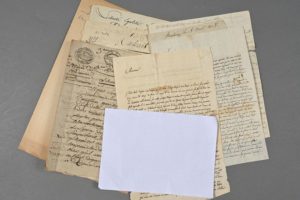 GUERRES DE LA RÉVOLUTION. Plus de 25 documents. - 4 lettres de soldats : 2 très intéressantes pendant la campagne d'Italie de 1794 écrites de Varsi (près de Parme) : « […] cette attaque a été au préjudice des Français qu'ils y ont laissés quatre mille morts, sans compter les nombreux prisonniers et blessés. Comme c'étoit un endroit où ils ne pouvoient conduire des canons, ils s'étoient mis en idée de venir prendre ceux des Autrichiens en se jettant en foule contre les bouches à feu, mais étant tous chargés à mitraille, ils en ont fait un massacre prodigieux […] ». Lettre de Strasbourg sur la « destruction de l'armée austro-russe en Suisse » (vendémiaire an 8). Lettre de Waldsée (août 1797 avec marque postale de l'Armée d'Allemagne) : « […] on dit que la 1ère colonne pour ce grand voyage de Russie partira dans les premiers jours d'octobre, cependant je ne crois pas que nous partions cet hiver, je crois même pas avant le mois de mai 1798, en attendant les communications […] » - une douzaine de certificats militaires et nominations (période révolutionnaire) + un billet de logement. - une dizaine de lettres diverses par des citoyens témoignant des événements et de la vie sous la Révolution (textes souvent intéressants).