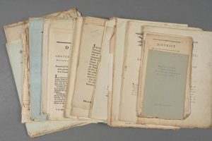 IMPRIMÉS. Bel ensemble d'environ 70 pièces. - Rapport fait à la Société des Amis de la Constitution par Collot-d'Herbois (6 juillet 1791, sur l'affaire de Nancy), « Discours de M. Morand, à l'Assemblée nationale, en lui présentant l'Histoire de la Sainte-Chapelle-Royale du Palais » (juillet 1790), « District de Saint-Louis-la-Culture, du mercredi 7 avril 1790 », « Régie générale des Poudres et salpêtres de la République. Action révolutionnaire », lettre du ministre de l'Intérieur aux corps administrés, rapport sur le traité conclu à Bâle, rapport par Barère sur les crimes de l'Angleterre - Décrets, lois sur : l'accusation contre le cardinal de Rohan, l'attentat contre Basseville, la nomination de Pichegru comme général en chef de l'Armée du Nord, la « punition des instigateurs & fauteurs des excès commis par les régiments en garnison à Nancy », les événements des 2 septembre et 10 août 1792, l'ouverture du canal de jonction de la Saône à la Seine, le remplacement des fleurs de lys par le « bonnet de la liberté », l'arrestation de tous les sujets du roi de la Grande-Bretagne, la suppression des compagnies financières, les accusateurs publics, les mendiants dans Paris, la réquisition des cordonniers, la fourniture de souliers pour les armées de la République, l'interdiction de sortie des « drilles ou chiffes », le dessèchement des marais, l'enlèvement des signes de royauté et de féodalité, l'habillement « des citoyens reconnus pour s'être distingués à la prise de la Bastille », l'emprunt forcé de un milliard « sur tous les citoyens riches », la convocation de la première législature, les « mesures répressives des conjurations contre le Peuple français & sa liberté », l'abolition du régime des haras, le « pain de munition », les tanneurs et fabricants de peaux, les brevets d'invention, etc. - 5 affiches sur divers sujets.