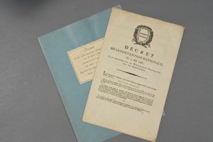 LEVÉE EN MASSE. Pièce signée par Joseph LAKANAL, MERLIN DE DOUAI, AMAR, DELACROIX. 3 pp. in-folio. Paris, 25 août 1793. Sceau sous papier de la Convention nationale. Décret de la Convention du 23 août 1793 prescrivant et organisant la levée en masse.