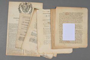 [LOUIS XVI ET LA FAMILLE ROYALE]. 8 documents. - Facsimilé du testament de Louis XVI et placard imprimé de son testament (32 x 20 cm). Facsimilé du procès-verbal d'exécution de Louis XVI - 2 décrets (différents) sur « le jugement des conspirateurs & des frères de feu Louis Capet par le Tribunal révolutionnaire ». - « Décrets relatifs à tous les individus de la famille des Bourbons » (6, 7 et 8 avril 1793) + décret relatif au concordat passé entre Louis-Philippe-Joseph d'Orléans et ses créanciers. - Acte du Corps législatif du 8 février 1792 au sujet de l'accusation portée contre « Louis-Stanislas-Xavier, Charles-Philippe & Louis-Joseph, princes françois ». - Plaquette imprimée : « Opinion du citoyen Enlart […] sur le jugement de Louis XVI ».