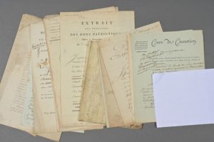 PERSONNAGES DE LA RÉVOLUTION. 16 lettres et pièces signées. Lettres signées par MERLIN DE DOUAI (3), DUBOIS-CRANCÉ (à Merlin), LANJUINAIS, C.A. PRIEUR, PARÉ (brevet de pension pour un fermier général), CHAUVELIN (laissez-passer pour le tribun ISNARD, mauvais état, contrecollé), AMELOT, D'AUBIGNY, PIIS, COULOMBEAU (3, Garde Nationale Parisienne, Commune de Paris et certificat de dépôt décoration de Saint-Louis), AUBERT (2). On joint une dizaine d'autres documents : patente, 2 suppliques au Directoire, certificats, etc.