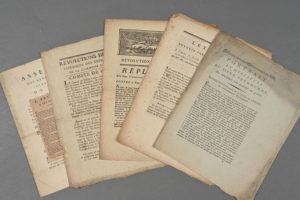 [RÉVOLUTIONS DE PARIS]. 5 imprimés in-4, août - décembre 1789. Ensemble de factums au sujet du différents survenus contre le directeur et éditeur du journal Révolutions de Paris, Louis-Marie Prudhomme : « Portrait en miniature du sieur Prudhomme en attendant son portrait en grand. Le comité révolutionnaire de la section de l'Unité au calomniateur Prudhomme » (12 pp. in-4) ; « Lettre envoyée par M. Legendre à l'auteur du journal des Révolutions de Paris à l'occasion de l'article de ce journaliste […] » ; « Révolutions de Paris - Réplique du sieur Tournon contre le sieur Prudhomme », etc. Il est joint un avis de Prudhomme à ses concitoyens justifiant la cessation du journal (1794).