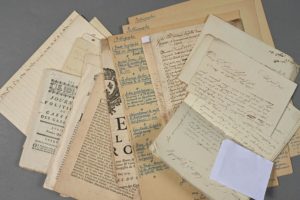 ANCIEN RÉGIME. Plus de 30 documents divers, XVIIe-XVIIIe. - Correspondance du baron de Saint-Julien (7 lettres), sur la gestion de ses domaines et les nouvelles du temps. « [8 fév. 1779]. Le Roi vient aujourd'hui à Paris dans la matinée, faire des ? à N. Dame et Ste Geneviève, pour l'heureux accouchement de la reine […] ». - [Guerre de succession d'Autriche]. P.S. « Louis » (secrétaire) : « Ordonnance du Roy pour l'incorporation de quelques détachemens de milice dans plusieurs régimens d'infanterie, de cavalerie et de dragons, de retour de Prague, destinés à servir cette année en campagne » (1743, déchirure atteignant un mot, salissures) - 3 congés militaires du XVIIe, l'un signé par Louis de MONTGOMMERY - Parchemin sur la saisie et la vente des biens de La Rochefoucauld-Buyers (1754). - 3 affiches diverses du XVIIIe - 3 imprimés sur les charges de la basoche (1724), la conservation des archives (1692), la fabrique des poudres et salpêtres (1736) + un exemplaire du Journal politique (1775, sur les affaires de Turquie) - Documents divers : mémoire corrigé sur la fête de la translation de Saint-Nicolas, correspondance personnelle adressée à Thomé « officier au régiment des gardes françoises à l'armée du Bas-Rhin » et à Moulins (7 lettres, 1761-1762), passeport pour un prisonnier de l'expédition de Jersey (1781), joli certificat militaire, guerre de sept ans, cahier de comptes (1722-1725), etc.