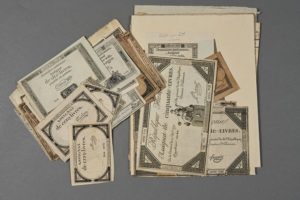 ASSIGNATS. - 5 imprimés révolutionnaires : « Caisse patriotique de la chapellerie de la ville de Lyon pour l'échange des assignats de deux et trois cents livres en mandants de vingt sous, trente sous & trois livres, établie par diverses maisons de chapellerie » ; « Loi relative au numérotage des assignats » ; lettre circulaire des autorités de Laval sur l'échange des assignats (août 1791), « Tableau de dépréciation du papier-Monnaie dans le département de la Seine calculé sur l'unité de 100 liv. assignats et 100 liv. mandats à partir du 1er janvier 1791 », etc. - 36 assignats de différents types et différentes valeurs : 25 sols, 5 livres, 50 livres, 100 livres (x7, domaines nationaux), 250 livres, 100 francs, etc.