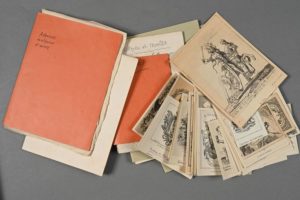 EX-LIBRIS ET ÉTIQUETTES DE LIBRAIRES. Une petite boite d'archives contenant un petit ensemble d'ex-libris (+ des facsimilés) et des adresses et étiquettes de libraires XVIIIe. Ex-libris : voir également n°52