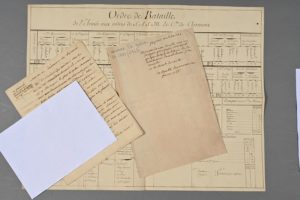 GUERRE DE SEPT ANS. Grand tableau manuscrit : « Ordre de bataille de l'armée aux ordres de S.A.S. M. le Cte de Clermont ». 38 x 50 cm. Il est joint un manuscrit XVIIIe : « Marche des colonnes de l'armée » (6 pp. in-4).