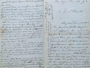 GUERRE DE 1870. Lettre d'un soldat (J. Chesneau) à ses parents. 4 pp. in-8. Boulay [Boulay-les-Barres, Loiret], 14 9bre [1870]. Très émouvante et intéressante lettre d'un garde mobile, toute consacrée à la bataille de Coulmier (9 novembre) à laquelle il participa. Il raconte les circonstances, le déroulement et l'horrible spectacle du champ de bataille. « […] la canonnade était précipitée de chaque côté, les Prussiens étaient embusqués aux abords d'un bois ; nous avons eu beaucoup de mal à les en déloger, notre artillerie a été victorieuse. Les mobiles de la Dordogne se trouvaient déployés en tirailleurs tout près du bois, se rallient, entrent dans le bois et chargent les Prussiens à la baïonnette. Ces malheureux se trouvaient entassés dans ce bois, nous avions 2 mitrailleuses qui faisaient un effet écrasant sur cette masse prussienne ; ces pauvres malheureux criaient, c'était pitoyable de les entendre ; ils battaient donc en retraite, une batterie d'artillerie soutenait leur retraite, elle nous faisait bien des ravages parmi nous […]. C'est là où j'ai eu le plus peur. Nous étions dans une position qui n'était pas tenable, c'était une pluie de balles et d'obus, c'était effrayant. Ce qu'il y avait de plus malheureux c'est que ma compagnie ne pouvait pas faire le coup de feu et nous étions ajustés de tous les côtés. Nous étions couchés à plat ventre sans cela nous étions décimés. Nous avons eu dans ma compagnie 4 tués 8 blessés […] Après le combat, que c'est triste de marcher sur les morts et d'entendre les plaintes des blessés, passer à côté d'eux sans pouvoir leur porter secours, la moitié de ces blessés manque de secours, meurent sur le champ de bataille, le service d'ambulance est très mal fait, il faut dire que beaucoup de nos blessés ont passé la nuit sur le champ de bataille et Dieu sait s'il a plu, c'est honteux. J'ai été si impressionné si sensible de voir ces malheureux que je ne puis m'empêcher de vous en parler […] ».