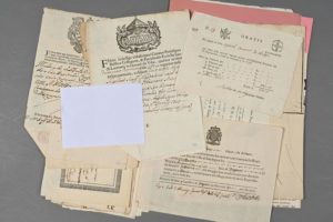 ITALIE. 45 documents, XVIIe-début XIXe, la plupart en partie imprimés, certains avec jolies vignettes gravées. En italien. Certificats, quittances, lettres de voiture, laissez-passer, affiche de 1848 « Comitato di Guerre in Civitavecchia popoli della provincia », courriers concernant l'épidémie de choléra de 1830, connaissement maritime, lot de « Gazzettino Mercantile », etc.