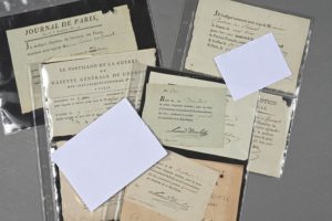 [JOURNAUX RÉVOLUTIONNAIRES]. 20 pièces préimprimées, complétées et signées, 1789-1816. Ensemble de reçus et quittances de souscription pour des journaux révolutionnaires : Journal du Patriote françois (août 1789), Journal de la ville (août 1789), Journal d'État et du citoyen (oct. 1789), Gazette Nationale ou le Moniteur universel (juillet 1790), Journal de Paris (mars 1792), l'Ami des lois, Journal de l'Ami des lois (an 7), Le Postillon de la guerre (juillet 1792), Courrier universel (brumaire an 4), Le Courrier du jour (an 6), Le Publiciste (an 7), Journal des débats (an 1), Feuille de Lille (an 9), Gazette de France (1816). Ainsi que 2 prospectus pour le Journal de physique, chimie, d'histoire naturelle et des arts et Le Surveillant.