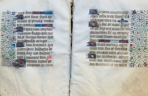 LIVRE D'HEURES. Manuscrit fragmentaire sur vélin. France du nord, vers 1400-1450. Dérelié. Cahier de 36 pages, 104 x 77 mm. Petite mouillure en tête des 2 derniers ff., petit manque angulaire à un feuillet sans perte de texte ou de décor. Ce manuscrit fragmentaire d'un livre d'heures contient une partie de l'office monastique (sexte, none, vêpres et complies) et le début des vigiles des morts. Il comprend néanmoins de larges lacunes entre tous les offices, correspondant à des pages avec des miniatures qui ont été retirées. Il en résulte qu'aucun office n'est complet. Composition : ff. 1-5 : Fin du texte de sexte, lacune de 2 ff., ff. 6 et 7 : texte de none (lacune d'au moins 1 f. entre 6 et 7). Lacune d'au moins 1 f. ff. 8-9 : vêpres Lacune d'au moins 1 f. f. 10 : vêpres Lacune d'au moins 1 f. ff. 11-12 : vêpres Lacune d'au moins 1 f. ff. 13-14 : les complies. Lacune d'au moins 1 f. ff. 15-18 : vigiles des morts Décor : Toutes les pages ont une bordure extérieure de rinceaux fleuris. Chaque verset ou début de prière est ponctué d'une lettrine, à l'encre bleue, rouge ou à la feuille d'or. Bien que l'absence de grande miniature ne permette pas de dater ni de localiser plus précisément le manuscrit, cette production est néanmoins typique du nord de la France, dans la première moitié du XVe siècle.